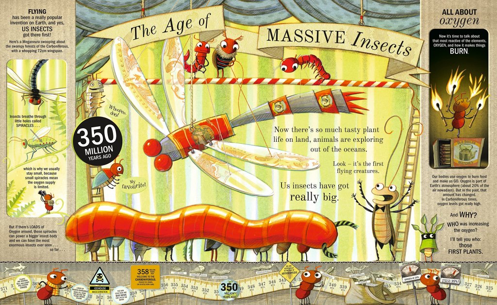 This is a fantastically engaging non-fiction text for curious young minds which is both wonderfully entertaining and brilliantly informative. I loved the appealing layout, set out as a theatre. Each double-page spread has the Main Stage with lots of bright and expressive illustrations with interactions from the insect narrators and a conversational, humorous writing style. In the Wings, there is more detailed information which I found absolutely fascinating. Along the bottom of each page, in the Orchestra Pit, is a Tape Measure of Time which provides a pictorial and written timeline of key events in Earth’s evolution.