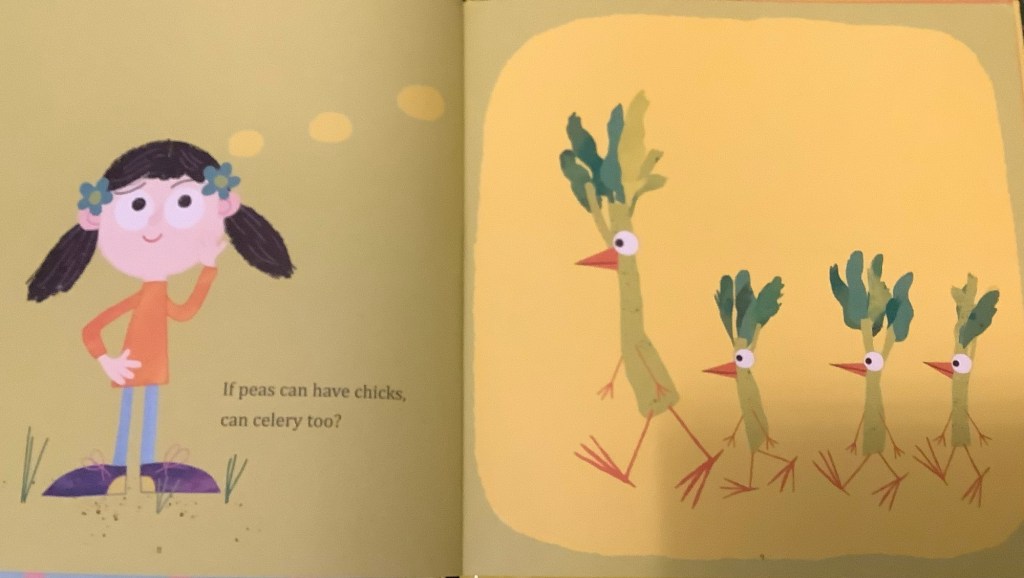 The illustrations are gorgeous and are drawn against mostly bright backgrounds with a vibrant colour palette with repetition of beaks, eyes and feet to make the curious collection of chicks easily recognisable in all their brilliant and weird representations. I particularly loved the celery chicks and the umbrella chicks.